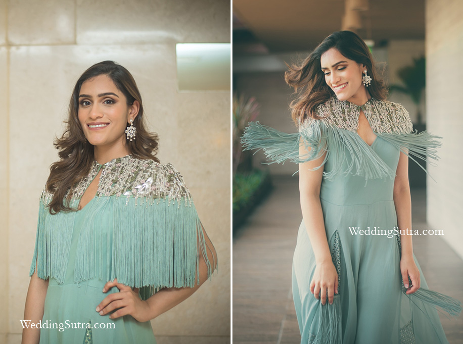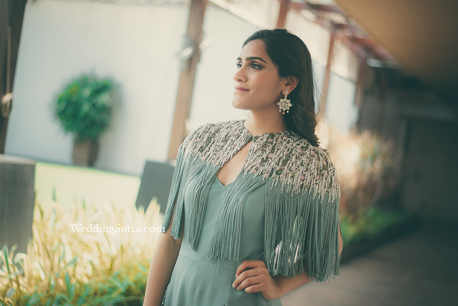 Anushi’s outfit of choice was a sea green gown from Aza Fashions. The ensemble came with a fringed cape that featured intricate embroidery on the shoulders. To go with this contemporary look she picked out a pair of gorgeous floral earrings from Kalyan Jewellers, “Jewellery with floral designs are not uncommon but what makes the pair of earrings I wore stand out is the timeless charm it radiates with. The asymmetrical stones, set in proportioned frames balanced form with whimsical aesthetics making it a design that is one-of-a-kind.”