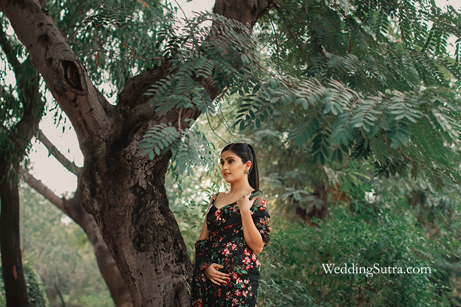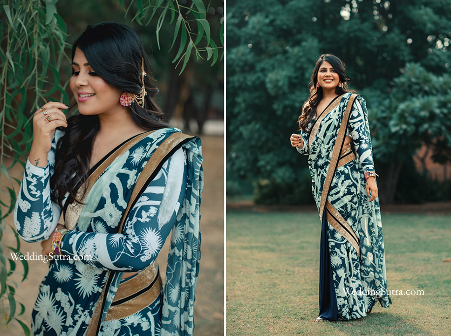 Chikky wore a blue Shivan & Narresh saree that bore large floral patterns in white. The contrasting colors complemented each other brilliantly and the solid colored pleats in the front made for an eye-catching feature. Contemporary pieces of jewellery from Outhouse completed the entire ensemble.
