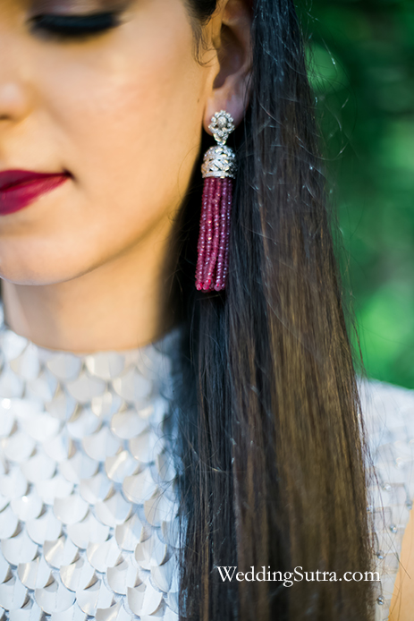 Nazish’s jewelry from DNA Jewels included intricately crafted pieces with fiery red stones and diamonds. They added a pique of color and drama to her silver lehenga with shimmering fish scale detailing by Pankaj and Nidhi. She says, “I loved the two statement rings I wore with my leaf motif diamond bracelet. The crimson crystals of my tassled earrings matched my ruby lips perfectly. With bold eyes and sleek hair, makeup artist Neha Shah enhanced the chic, unique cocktail party look. The ensemble was complete with a spritz of the exquisite perfume, Nude from Skinn that enraptured me in a romantic mist of fruity and floral notes“