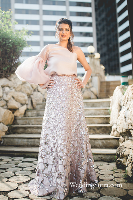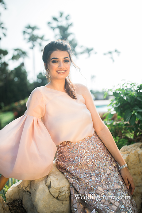 Sanchi loves pastels and adored the one shouldered, puffed sleeved blouse in blush that she paired with an eclectic lehenga that shimmered with a broken mirror effect. Feminine and flirty, this outfit by Pankaj and Nidhi was accessorised with an elegant diamond bracelet with leaf motifs and earrings cascading with glittering emerald cut diamonds from DNA Jewels. Of her pulled hairdo, dewy makeup and bold lipstick by Awantica Sharma, Sanchi says, “The look was romantic and contemporary, and perfect for a cocktail party.”