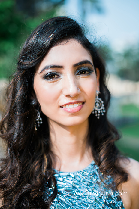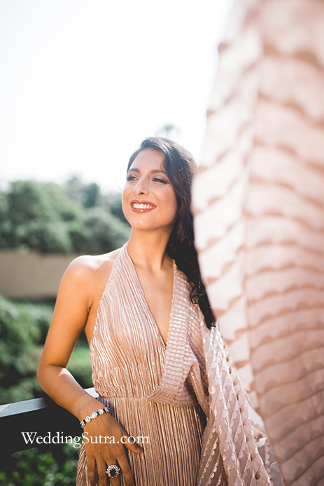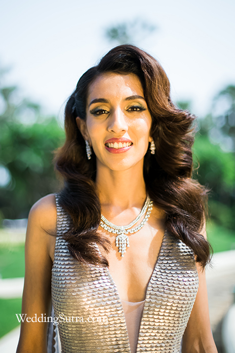 Jamila found the Taj Lands End with its swaying palms and the Arabian Sea views to be the perfect backdrop for their elegant cocktail party shoot. “I was swept away by the stunning diamond set by DNA Jewels that I had the opportunity to wear! It just looked enchanting against my dreamy gown by Pankaj and Nidhi with its shimmering train and draped cape detailing. The retro 70’s glam visage Neha created for me was the perfect accompaniment for the look. Topping the look with a few sprays of SKINN perfumes from my bridesmaid gift pack, I truly felt like a diva!”