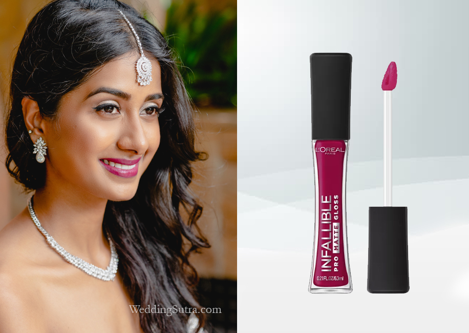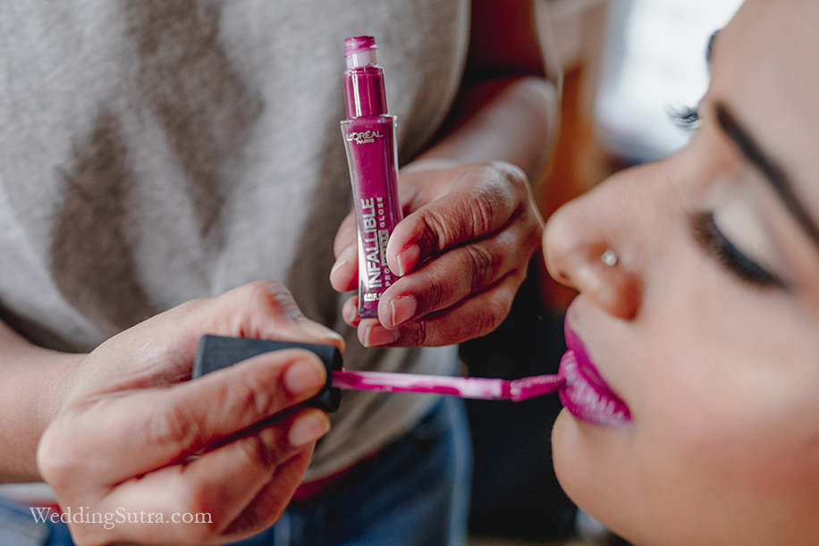 One golden rule for bridal make up is choose a lip color from the same color family as your outfit, but a few shades darker. So, while creating Shivali’s look, makeup artist Neha Shah used the L’Oréal Paris Infallible Pro Matte Liquid Lipstick – 310 Forbidden Kiss. The rich purple with high pigments left a lasting color and gave the soft lilac of her gown a bold twist. She framed her face by bringing definition to her eyebrows with the help of L’Oréal Paris Brow Artist Genius Kit Medium To Dark. The angled spooley brush allowed a flawless application whilst grooming the brow into shape and the powder let her build on the layers of product for a deep color that gave her a strong look.