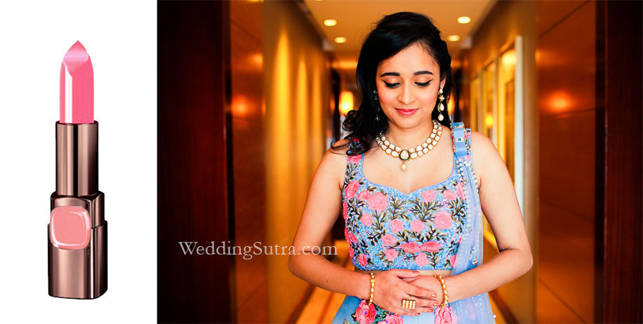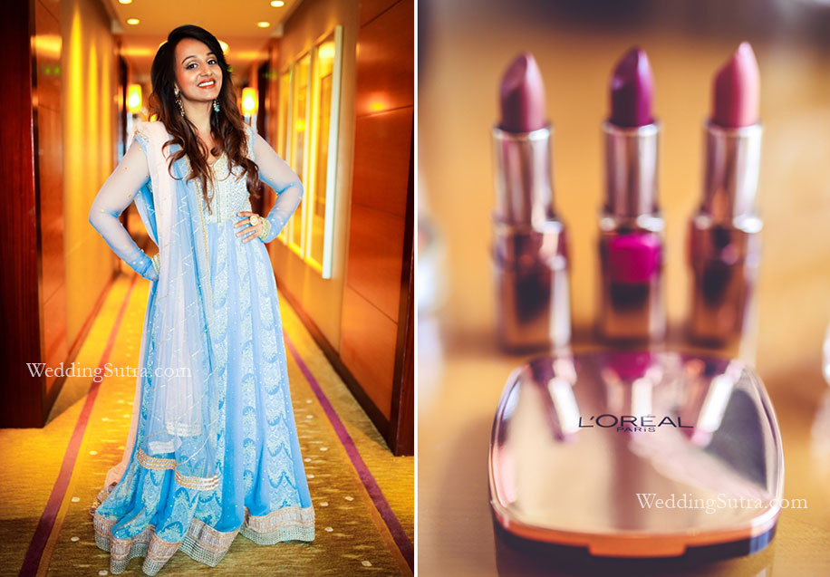 Pooja favored a feminine look and preferred to wear a beautiful Papa Don’t Preach blue lehenga with gentle cutwork flowers. Makeup artist Taniyaa Khanna created the perfect matte nude lipstick look by using L’Oreal Paris Color Riche Moisture Matte Lipstick in Beige Couture and a subtle brush of the Lucent Magique Blush.