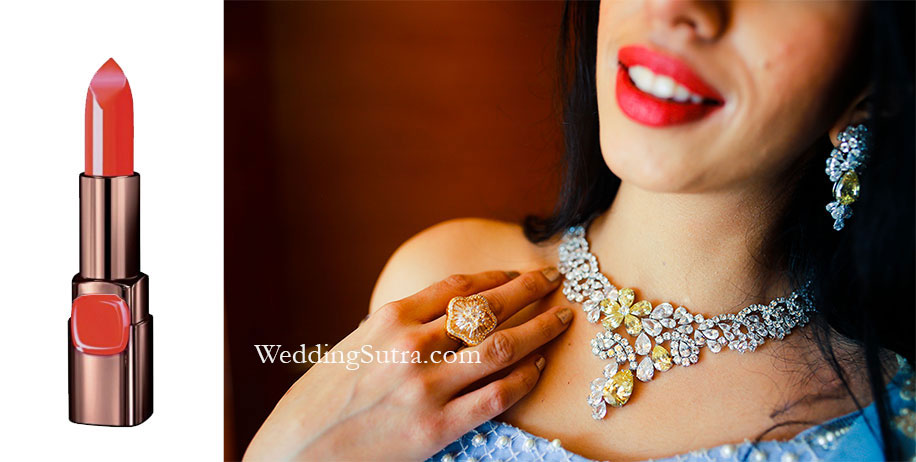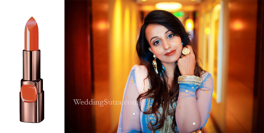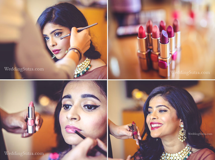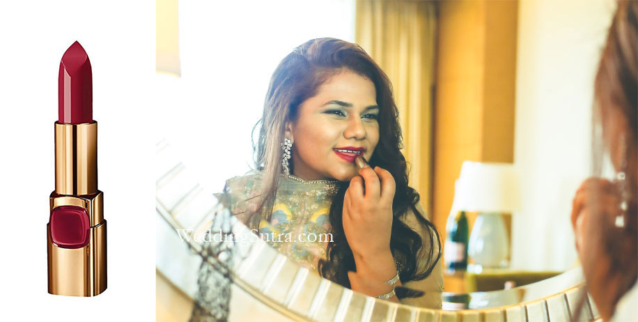 For Sneha it was a lehenga in royal blue with multicolored embroidery by designer Manish Malhotra. The stunning polki and emerald set by Bikaneri Jewels for Velvetcase and the matching bangles by SVJ, surely accentuated the gorgeousness of the attire and makeup to create a stunning ‘runway’ bridal look. Makeup artist Shamita Gogia worked on the bride, developing a glamorous look with statement lips. Sneha loved it, “Shamita made me feel so comfortable and beautiful. She gently brushed on the L’Oreal Paris Glam Bronzer to warm up my face. The La Palette eye shadow added dimension to my eyes and Le blush added a healthy glow to my face.” With lips being the main focus, Shamita accentuated them with L’Oreal Paris Color Riche Moisture Matte Lipstick in Wine Marsala.