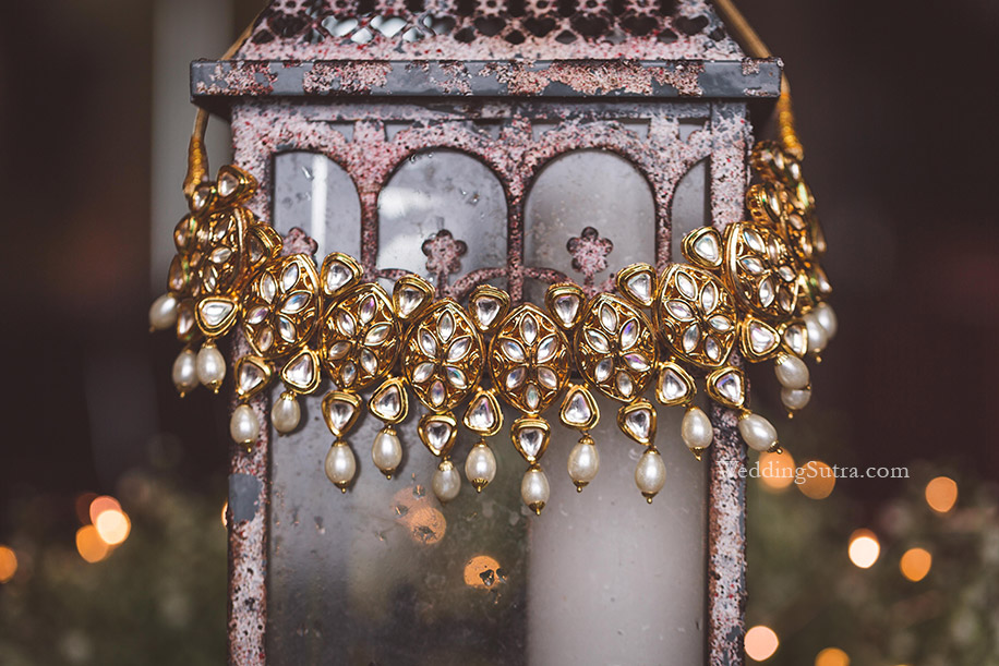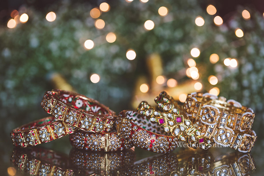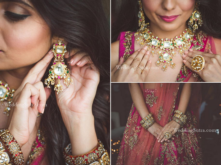 An avid follower of WeddingSutra’s insightful content via the site and its social media pages Zoya is a master of beauty and fashion trends and had always envisioned herself in a beautiful lehenga by Shyamal and Bhumika. Naturally, she was ecstatic at the chance to wear the fuchsia lehenga with gold work. She also loved the jewellery, “I was absolutely floored by the gorgeous jewellery and it definitely made me look like a royal bride!” Her gorgeous set from Just Jewellery featured pieces studded with white and colored stones. She wore a vibrant necklace with intricate designs and earrings that matched. The bangles and maang tikka added the quintessential traditional touch to the entire look.