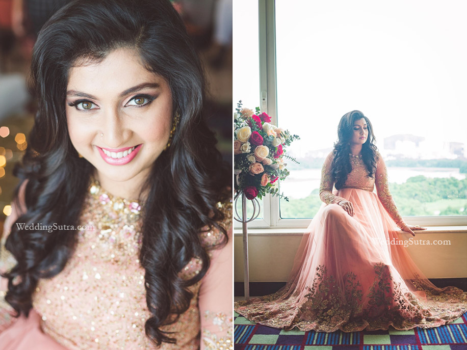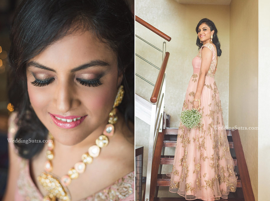 Gayatri’s powder pink Shyamal and Bhumika lehenga-gown was fortified with chunky gold embroidery so she accessorized with jewellery crafted with elements of peach enamel work. Crafted by Just Jewellery, the feminine designs brought a touch of opulence to the vintage glamour theme. With makeup structured to up the glamor ante, Gayatri was thrilled with the whole shebang, “The outfit was a dream! Shamita is a perfectionist and outstanding with hair and makeup. This was definitely a once in a lifetime kind of a day for us!”