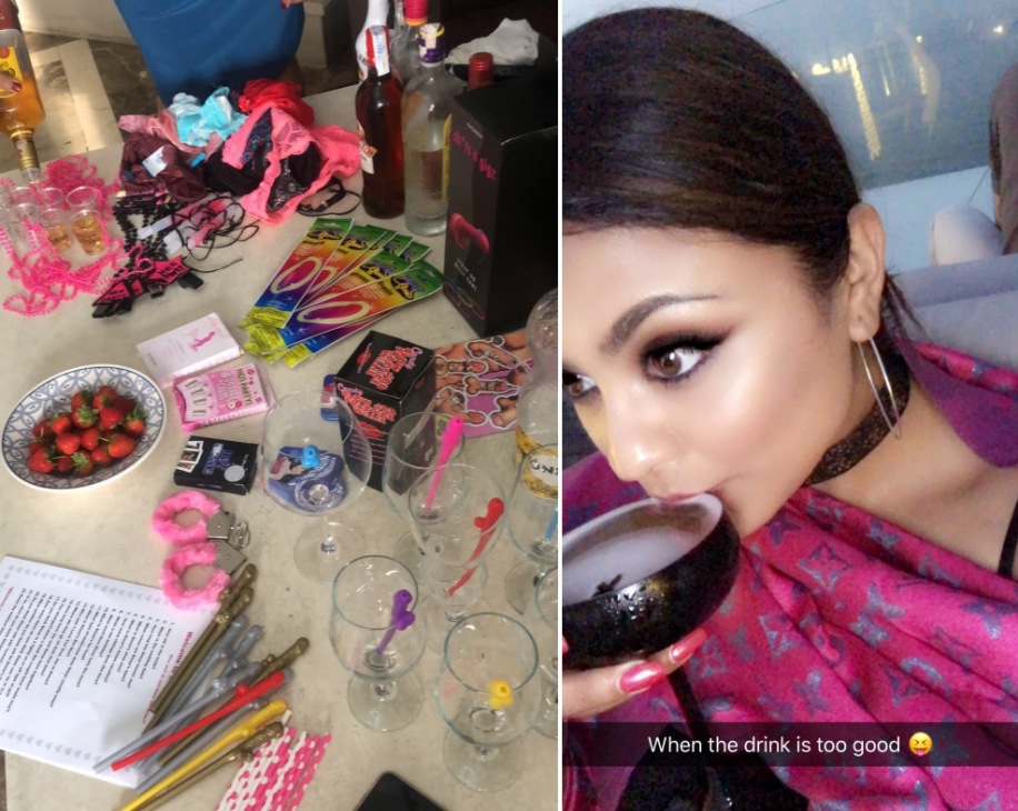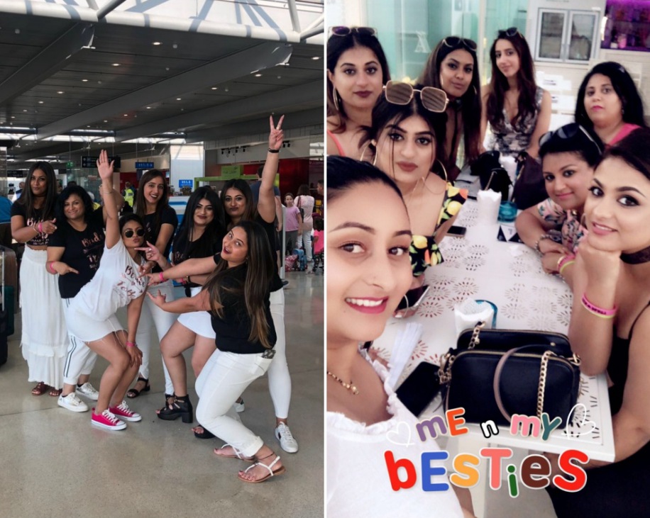 To make this girl trip extra special for her squad, Simar surprised her friends with a gift box. She adds, ”Each bridesmaid received a ‘Thank You’ box from me the night before we flew to Spain. The box contained a pair of beautiful Punjabi ‘Juttis’ (flat ethnic shoes), a bottle of Moet, and a tikka set along with a few naughty items. I got the ‘Juttis’ made by a company called ‘Tradition Meets Trends’ in India who were extremely accommodating and offered fast delivery and excellent quality. For the additional hen party props, I handed the girls beautiful t-shirts designed to coordinate their look at the airport. The games and other props were purchased from Etsy and Ann Summers.”