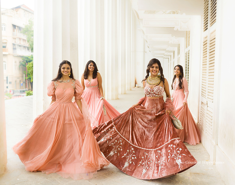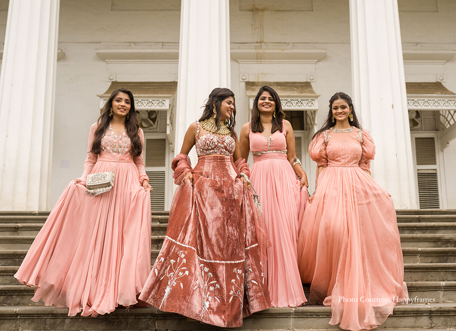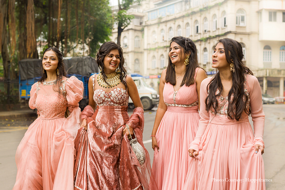 Your friends are the family you choose, and they have probably seen you through all the myriad ups and downs of life. Amidst the chaos of wedding planning, Twinkal wanted to honor her friends for always being there for her. She shares, “I can’t go a single day without talking to my squad. I always had a BFF shoot on my wishlist, and thanks to Happyframes and WeddingSutra, it was one of the most memorable experiences of my life.” The colonial architecture of South Mumbai made for a breathtaking yet nostalgic backdrop for the shoot. The bride and her squad wore beautiful outfits by Mahima Mahajan, and were styled by Stylist Sumalya Mehra and her team for the first look.