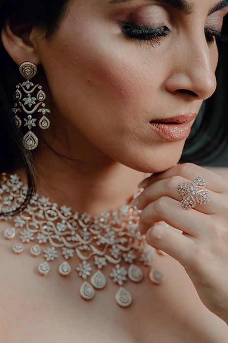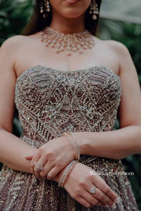 Aanchal settles for nothing short of flawless in her life, just like Tanishq Rivaah’s dazzling diamonds. A riveting confluence of floral motifs and dangling pearl-drop stones, this stunning perfectly offsets her muted lavender couture gown for her classy Sangeet. The modern shimmery silhouette and intricate beading of her ensemble is delicately accentuated with diamond bangles and rings.