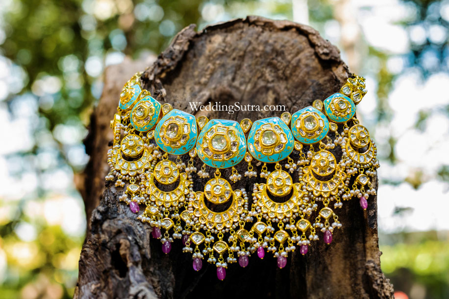 When it was time to pick out her jewellery, a meenakari necklace from Rivaah by Tanishq caught her eye. The sea green creation was bordered with intricate motifs separated by beautiful stones and surrounded by pink drop beads. To go with this, she opted for gorgeous gold bangles, a pair of exquisite earrings and a kundan ‘maang tikka’ (forehead ornament). For someone who doesn’t wear jewellery often, the beautiful ornaments impressed Akanksha. She shares, “The necklace from Rivaah by Tanishq was undoubtedly beautiful. I like traditional meenakari jewellery, and when I found this particular necklace set, I was more than excited to try it on. And of course, it went beautifully with my gorgeous outfit.”