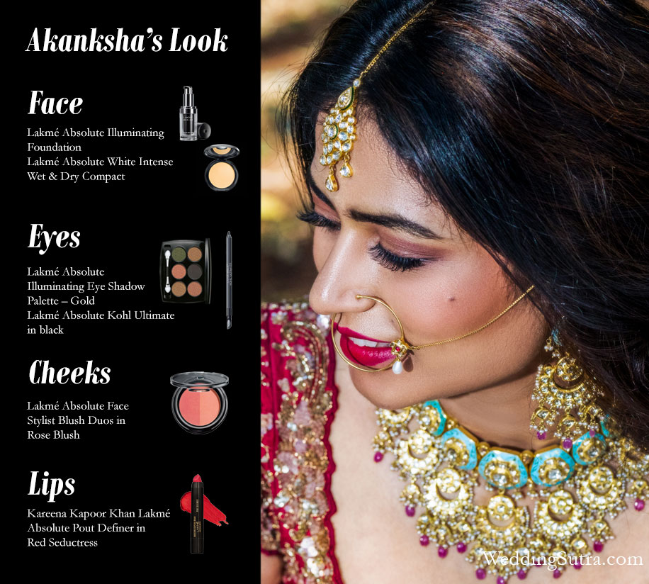 Akanksha’s bold red lips were the highlight of her makeup. Makeup artist Minee Khanna started by using the Lakmé Absolute Illuminating Foundation that gave her silky, dewy skin. To set it in, she patted a layer of Lakmé Absolute White Intense Wet & Dry Compact. Lakmé Absolute Illuminating Eye Shadow Palette – Gold was used to highlight the eyes and create warmth with tawny hues. To draw further focus to them, she lined her eyes with Lakmé Absolute Kohl Ultimate in black. To add a soft hint of rosy blush to the apples of the cheeks, Minee used the Lakmé Absolute Face Stylist Blush Duos in Rose Blush. She completed the look with the Kareena Kapoor Khan Lakmé Absolute Pout Definer in Red Seductress.