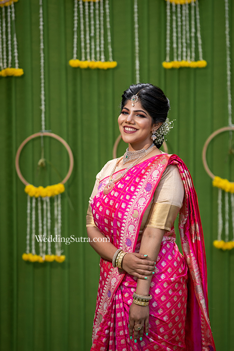 Shikha picked a bright pink silk s saree from Warp n’ Weft that displayed a chequered pattern and elephant motifs for Anviksha. The drape was edged with a paisley border that won the bride’s heart! She shares, “I am a South Indian and I was so pleased with this saree and the way it was draped on me. I thought Shikha did a great job putting all of it together. The styling enabled me to get a clearer idea of how I wanted to look like on my big day.”