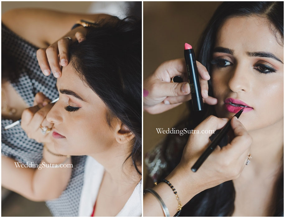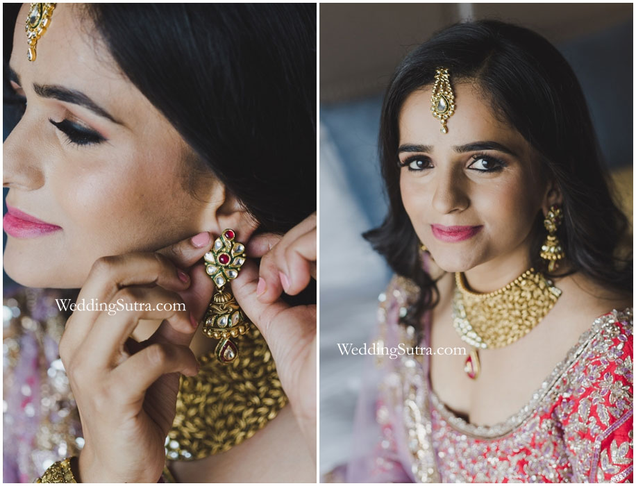 And speaking of gold, it was time to get to work on that ‘Golden Glow’ that is ruling your Insta. Using products by Lakmé Absolute’s new range, Kareena Kapoor Khan Collection, Sejal of Makeovers by Sejal built a stunning luminescence. Ayesha usually shies away from make-up but this was the look for her. She said, “I’ve seen ‘before and after’ pictures of brides where the makeup doesn’t just cake up the entire face but hides their personality as well. Sejal gave me just what I was looking for! The unique glow enhanced my face; it wasn’t cakey and I still looked like myself. The skin and diet tips she shared clearly spelled her expertise. Apart from the shimmery tinge, I really loved my lip color! I never thought a color from the pink palette would suit my skin tone, but she confidently proved me wrong. The best part was that the makeup stayed intact for hours!”
