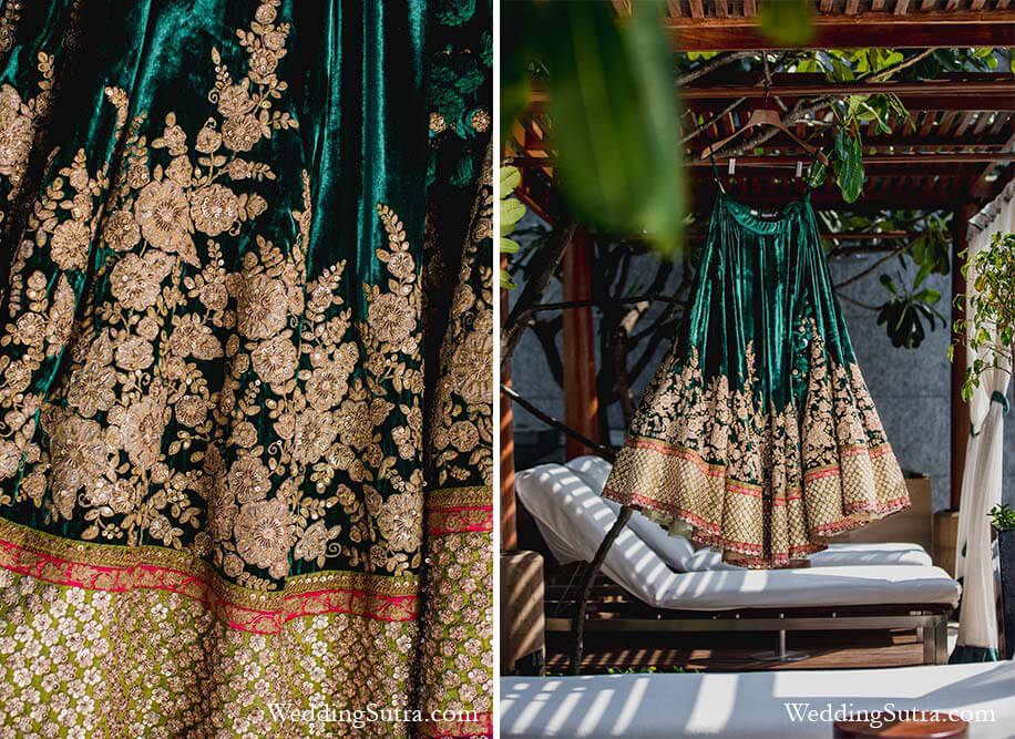 A velvet green heritage creation by Sabyasachi Mukherjee available at AZA Fashions