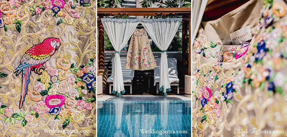 A floral lehenga by Neeta Lulla with parrot motifs along the poolside of Four Seasons Hotel, Mumbai