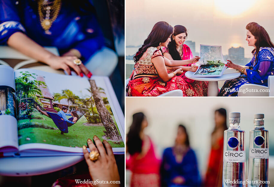 Brides-to-be Priyam, Dipti and Nidhi spend an evening flipping the A Travel Duet- Honeymoon Crafters Photo Safari Photobook at AER rooftop lounge at the 34th level of Four Seasons Hotel