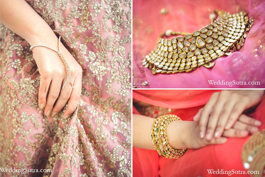 A trendy minimalist diamond-studded haathphool, an uncut diamonds necklace and gold kada studded with colored kundan by Gehna Jewellers worn by the brides-to-be.