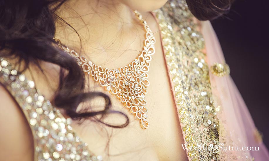 A rose gold necklace studded with diamonds from Gehna Jewellers worn by Naoumi.