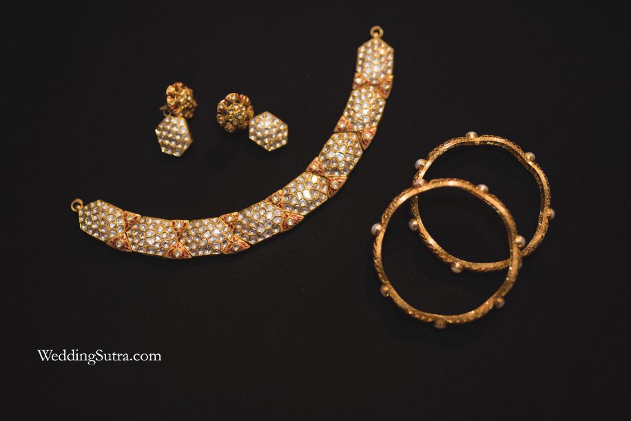 Her jewellery by AZVA was a perfect combination of sophistication and luxury, especially the gold neck piece that lent further luster to her ornate bridal look. She also wore gold bangles from AZVA. Evoking the essence of the seven sacred vows of marriage, the set blended ethnic aesthetics with versatile designs.