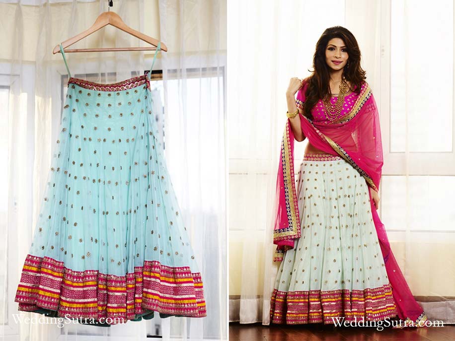Bride-to-be Dhvani Doshi looks great in a pink and pastel green Anubhav and Sneha bridal lehenga from Flyrobe that retails at Rs 45,000 and can be rented at Rs 5,299