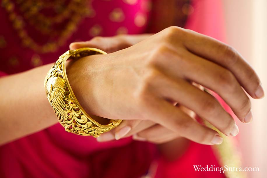 For jewellery I had my eyes set on an exquisite Azva Mag Mala in gold which beautifully complemented my bright-toned lehenga. I opted for a kada with intricate carvings to give a subtle update to traditional bangles.