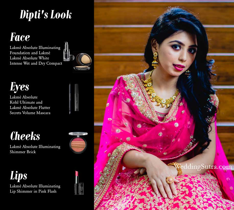 Dipti is blessed with a gorgeous complexion and makeup artist Cory Walia decided to accentuate it by giving her a flawless, airbrushed look with smoky eyes. He started with a light base, the Lakmé Absolute Illuminating Foundation even her skin tone and make it look dewy. He then followed it up with a light brush of the Lakmé Absolute White Intense Wet and Dry Compact on her T-zones for a truly vibrant finish. Cory created a stand-out effect by outlining Dipti’s eyes with the Lakmé Absolute Kohl Ultimate and finished the perfect, smoky, sultry look with coats of the Lakmé Absolute Flutter Secrets Volume Mascara.A subtle blush to Dipti’s cheeks courtesy the Lakmé Absolute Illuminating Shimmer Brick for that brought out her inner glow. The final touch was the hint of pink to match her lehenga – the Lakmé Absolute Illuminating Lip Shimmer in Pink Flash.