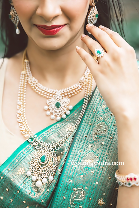 Drishti, our Telugu bride, took the unconventional path and chose an elegant diamond set from the Kalyan Jewellers’ Muhurat Wedding Collection, over glittering gold to pair with her green saree. The selected pieces with emeralds and diamond studs added a dash of color to her look. Keeping with the popular bridal trend, Drishti layered her diamond necklace with a similar piece in a different size. Both neckpieces are designed with a special feature of interchangeable center stones on the pendants which makes it easy to switch from emeralds to sapphires or rubies in a jiffy to match different looks and ensembles. This #KalyanMuhuratBride completed her look with emerald and ruby bangles, a diamond ‘oddiyanam’ (waist belt) and a matching ‘maang tikka’ (forehead ornament).