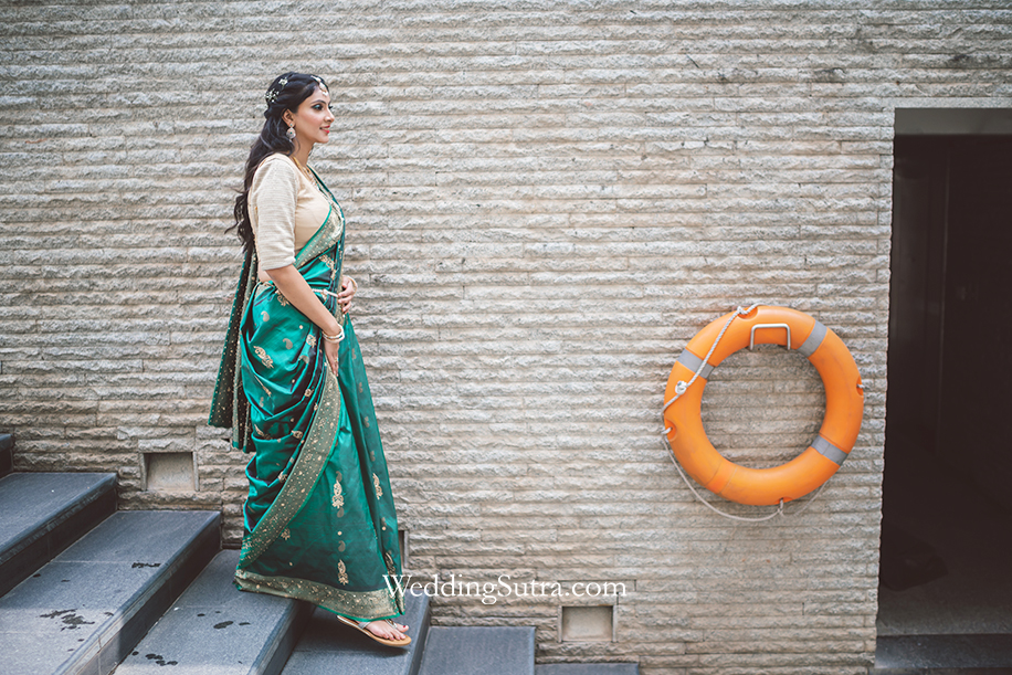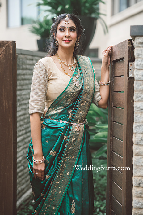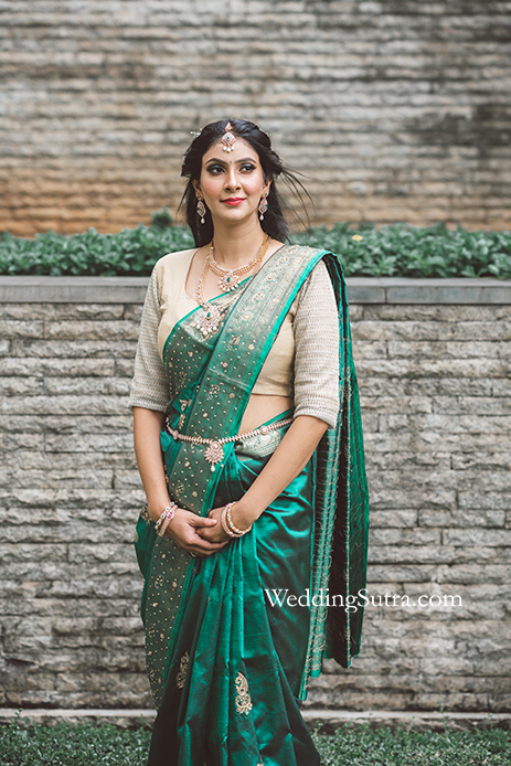 At every Telugu wedding, the focus is always on the bride’s outfit and jewellery. Shikha picked a beautiful royal green silk creation from Nalli Sarees. The saree featured zari butta threadwork on the borders and delicate zari embroidery all over. She teamed it with a beige blouse to tone down the look. Her outfit was in sync with her matching green emerald and diamond jewellery.
