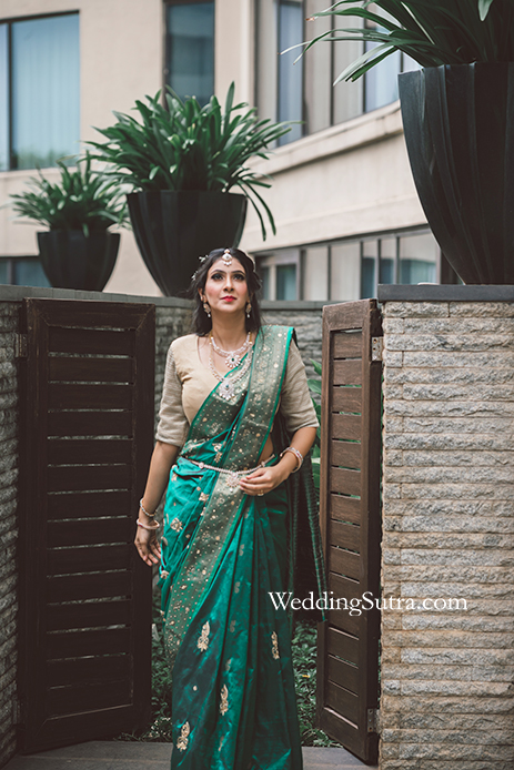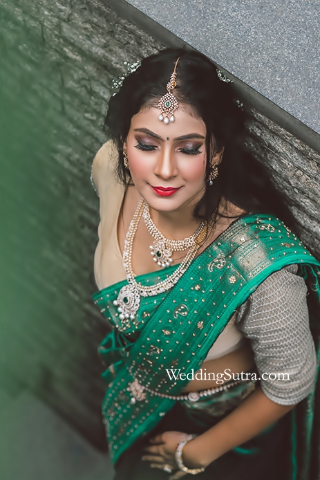 Drishti shares, “My experience with the entire shoot was fabulous. Chanderlata did a fantastic job. Usually, my makeup tends to oxidise and turns grey after application, but she did my base very well. My face tends to look a little plump in pictures but she gave me a nice, chiselled look by contouring my face. I loved the green saree on me which looked fabulous in the photos. The jewellery matched my entire look so beautifully that I plan on visiting the store again to purchase a few pieces for my wedding.“