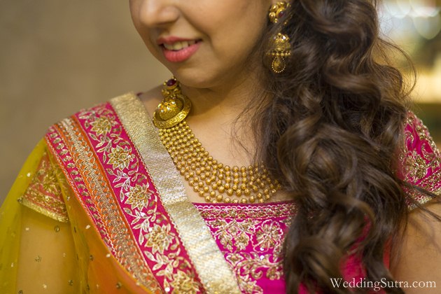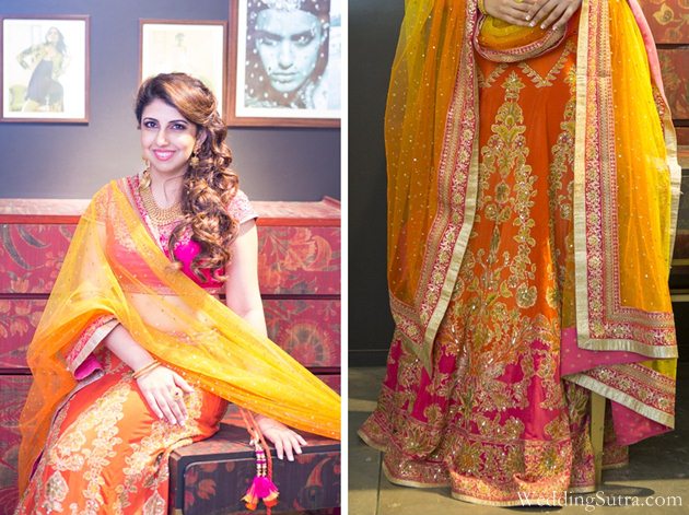 My experience at Ritu Kumar began with a warm introduction with the WeddingSutra team, the experts that they had invited and the other three brides-to-be. Soon I was looking through the shortlisted outfits with constant help and attention from Team WeddingSutra who ensured we were having a good time always! After multiple trials, I decided on a vibrant lehenga choli in a lovely combination of pink and orange with beautiful gold work on it. It was complimented with a yellow dupatta which added color and grace to the look.