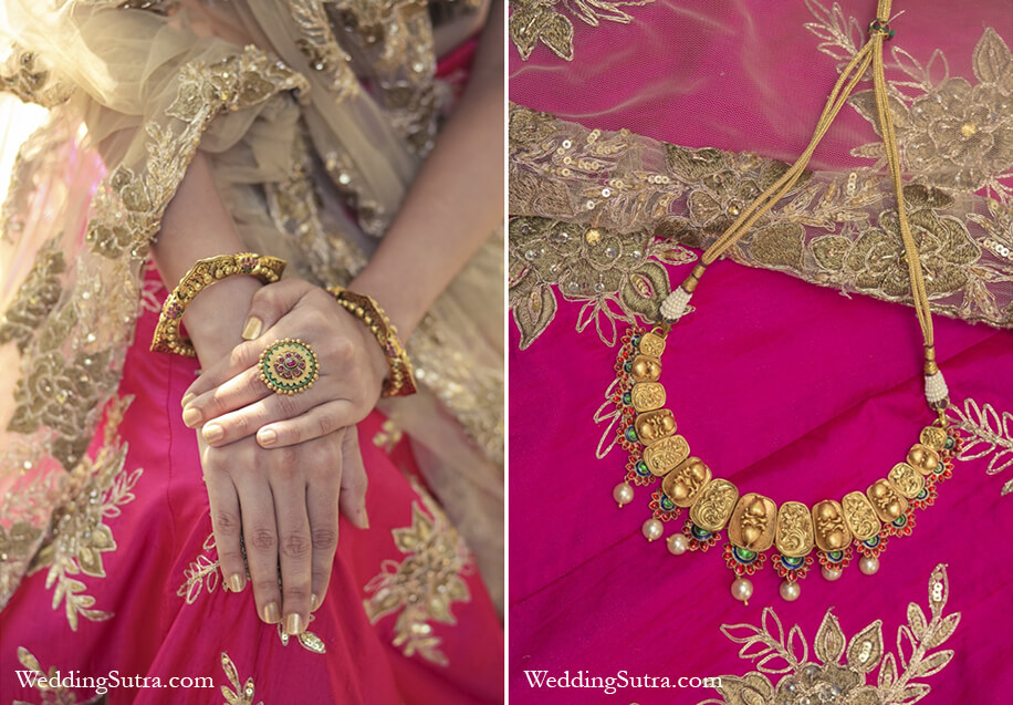 Then I accessorized with beautiful antique heirloom jewellery by Azva. It accentuated my look and I loved the fact that the jewellery didn’t weight me down: the gorgeous polki necklace and earrings had the most stunning green stones that contrasted beautifully with my pink and gold ensemble.