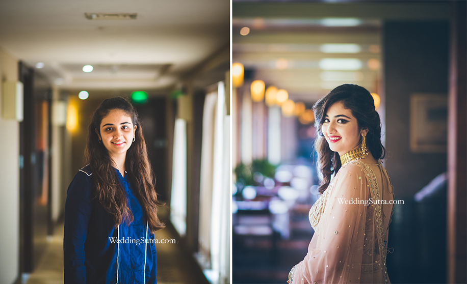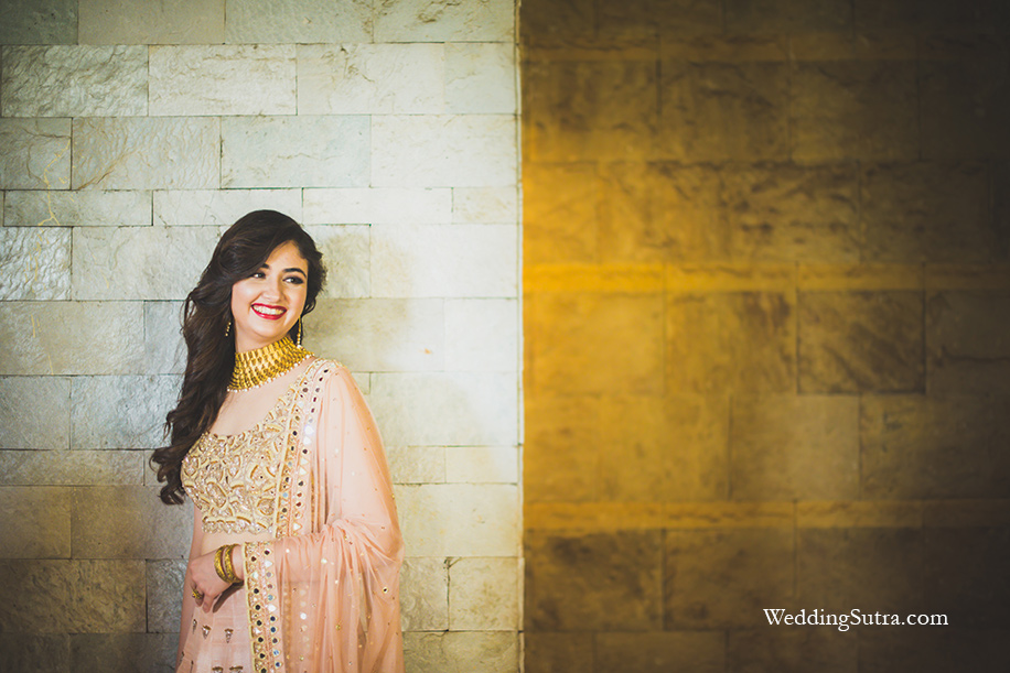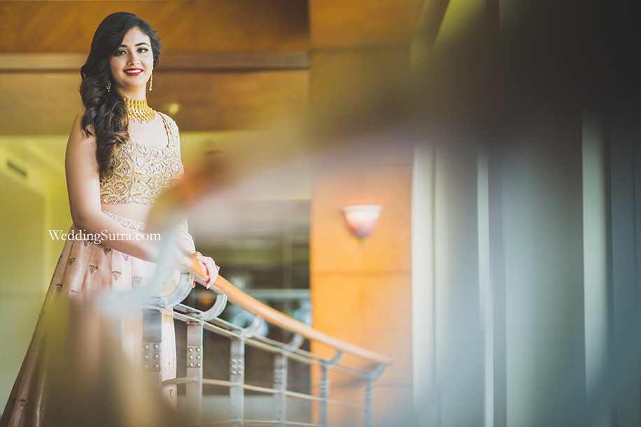 WeddingSutra’s most popular bridal initiative, WeddingSutra On Location, was held at the beautiful JW Marriott Mumbai Juhu. Bride-to-be Jhanvi Thakkar donned a beautiful peach lehenga by Arpita Mehta and paired it with gorgeous gold jewellery from Azva. Celebrity makeup artist Ojas Rajani skillfully brought out the best of Jhanvi’s features while WhatKnot helped her with essential tips as she posed gracefully for the pictures.