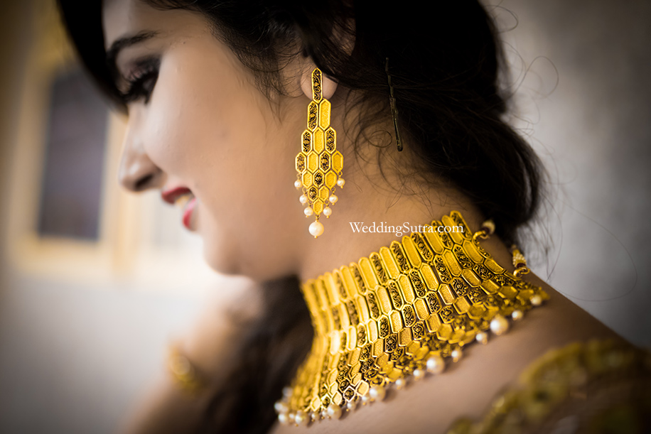 This bride-to-be then chose a necklace and earrings from Azva. The skillfully crafted jewellery was lined with pearls that brought romance to the design. The gold jewellery kept perfect time with the gold embroidery on her blouse and the ensemble was beautifully fluid. Jhanvi also picked gold bangles and statement rings featuring fine detailing and exceptional craft.