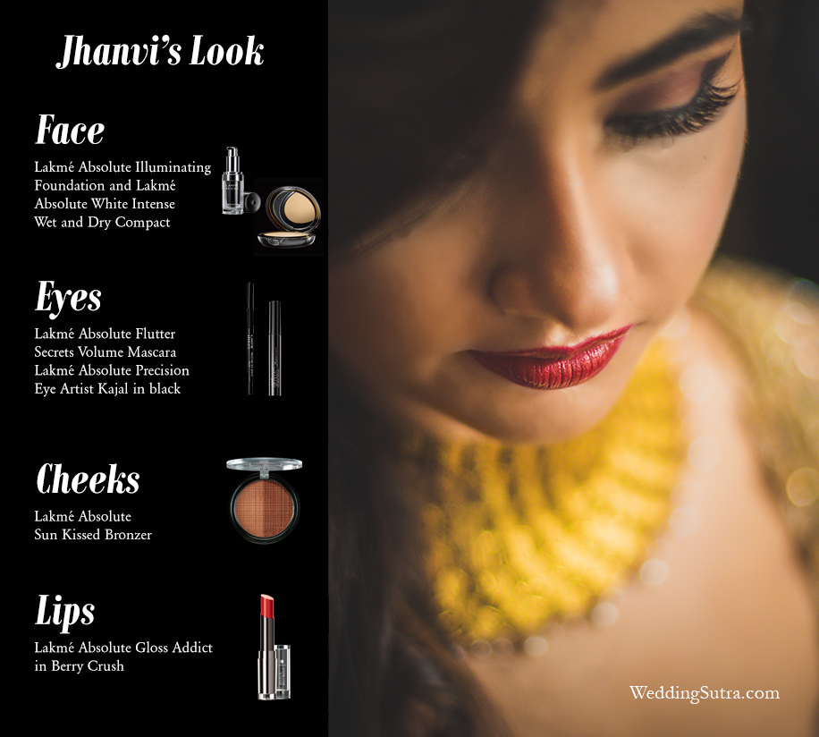 Celebrity makeup artist Ojas Rajani went with the spring bride opulence and gave Jhanvi a fresh and dewy look. The youthful visage also highlighted her flawless skin. She played up the drama with bold lip colors while letting the rest of the face exude a soft glow.