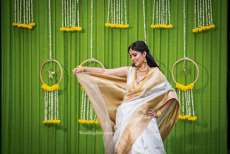 Stylist Shikha Dhandhiya chose the mundu-style white lehenga designed by Warp ‘n Weft for Krupa which was a perfect pick for her Malayali look. The white and golden combination enhanced Krupali’s features and the rich silk from which the lehenga was crafted glowed in the sunlight.