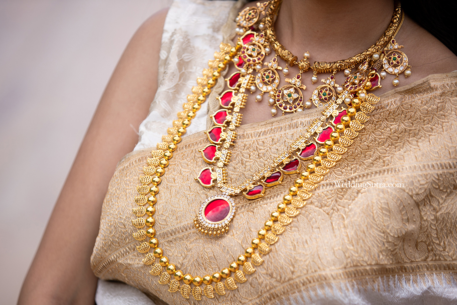 Krupali commenced the day by selecting the jewellery. Although she kept insisting intially that she wasn’t much of a gold person, she was enchanted with the ornaments presented to her. The beautiful jewellery chosen for her was from the Kalyan Jewellers Muhurat Collection. The exquisiteness of the designs and the hints of colour added the right poise to her bridal look. Closest to the bride’s neck was a gorgeous Rajasthani Hasli style contemporary neckpiece, embellished with pearls and gemstones. Staying in tune with tradition, the Palakka Mala, a longer necklace in a fiery red hue, drew instant attention against the subtle colours of her outfit. Adding to this grandeur was a Kuwaiti style re-creation of the beautiful Maanga Mala design that resembled the paisley design on her outfit. Adorning the bride’s hands were heavy gold bangles with intricate detailing that matched with a Navrathna contemporary ring and a grand Kundan cocktail ring. To complete this look, she also wore grand Jhumkas and a divine maang tikka from the Kalyan Jewellers temple jewellery collection that beautifully framed her face.”