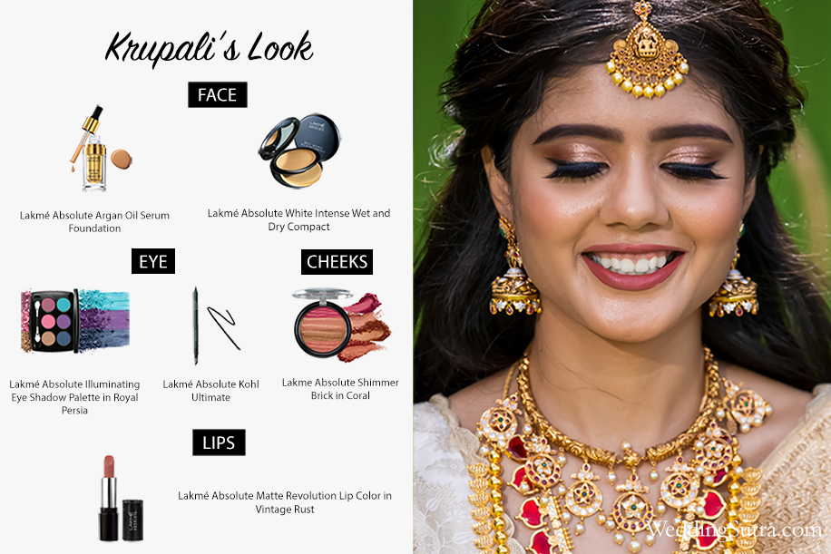 Keeping in mind the simplicity of Krupali’s outfit, Kajol stuck to giving her an understated elegant look. She started with the Lakmé Absolute Argan Oil Serum Foundation. Then the Lakmé Absolute White Intense Wet and Dry Compact was patted on her face to perfect her complexion. With the help of the Lakmé Absolute Illuminating Eye Shadow Palette in Royal Persia, Kajol intensified the bride’s eyes with a smokey finish, and darkened them with the Lakmé Absolute Kohl Ultimate. With the help of the Lakme Absolute Shimmer Brick in Coral, she added a touch of color to her cheeks and applied the Lakmé Absolute Matte Revolution Lip Color in Vintage Rust to highlight her pout with long-wearing rich pigments.