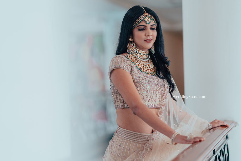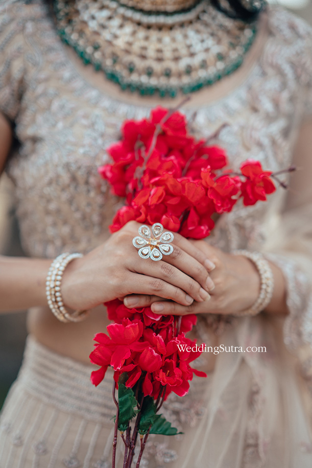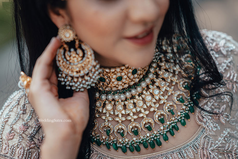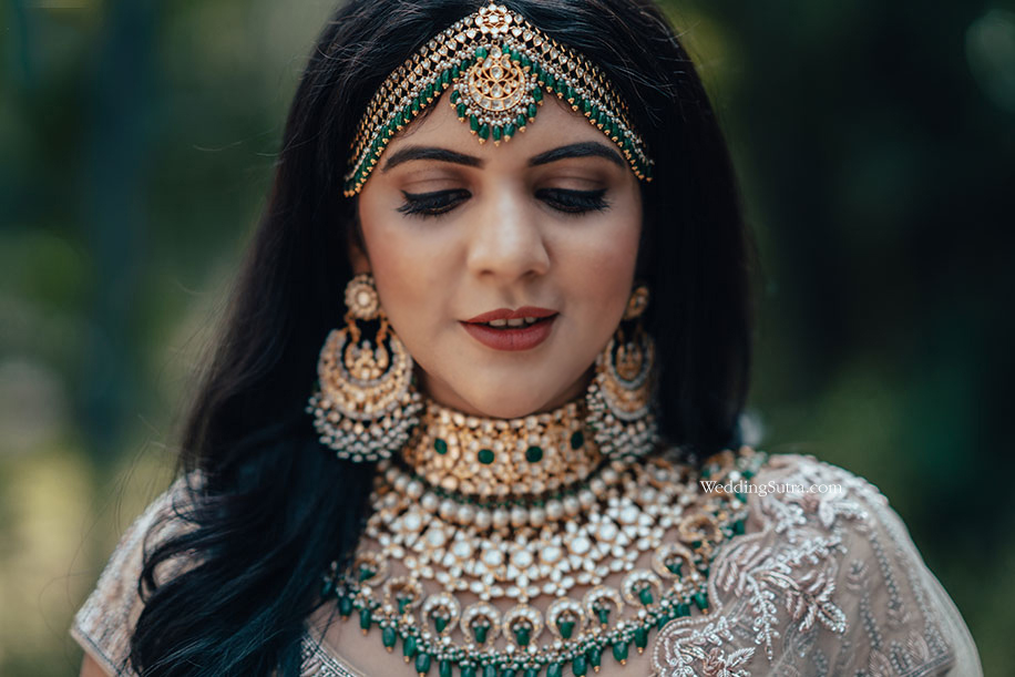 Maitri looked enchanting with makeup done by Richa Thakkar, who gave her an alluring bridal glow using products from the iconic Lakmé Absolute range of cosmetics. Precious moments from this special day were captured by Namit and Vipul of Knotty Affair. The day began with one of the most exciting parts of the bridal trousseau – the jewelry! Shikha styled this Sindhi bride with elaborate polki pieces from Kalyan Jewellers. Maitri looked resplendent in an emerald and polki choker, which she amped up with another necklace in the same style. With pearls, polkis, and beads, these necklaces beautifully complemented the matha patti chosen by the bride. Statement chaand baalis and a floral finger ring added glamour to her look. Maitri said, “I love to layer accessories. The double necklace styling and the royal matha patti made me feel like a queen.”