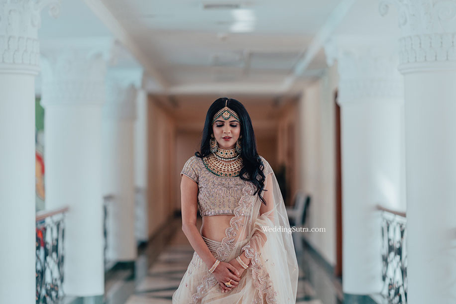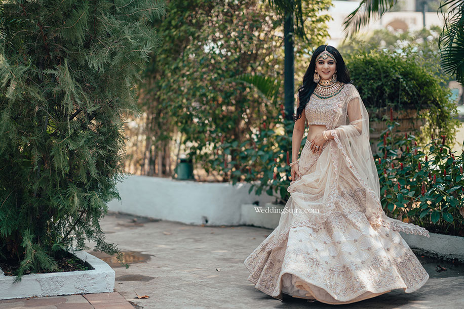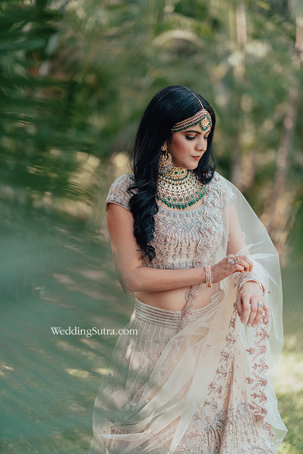 Shikha transformed Maitri into a traditional Sindhi bride with an embroidered and heavily-embellished off-white and silver lehenga by Disha Patil. Maitri says, “The outfit Shikha picked for me captured the opulence and regal aesthetics of a Sindhi bride. It also complimented the jewelry perfectly.”