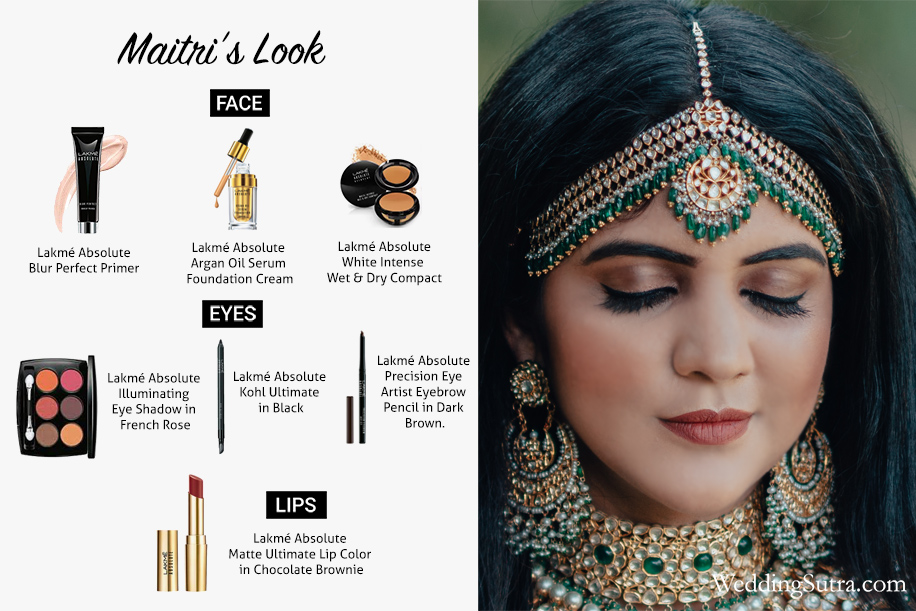 To enhance the beauty of the ensemble, Richa Thakkar used the Lakmé Absolute Matte Ultimate Lip Colour in the shade – Chocolate Brownie, which gave the bride a gorgeous pout. With the nourishment of argan oil, it ensures smooth application and leaves the lips feeling supple all day. Its unique formula, with an intense matte finish and luxurious color gave Maitri the most perfect pout. Maitri says, “It is a highly-pigmented shade which makes it perfect to be photographed. The rich shade suits all skin tones. I loved the entire look that Richa gave me. She worked according to my features and was very accommodating and accepting of my inputs, which made me very comfortable.”