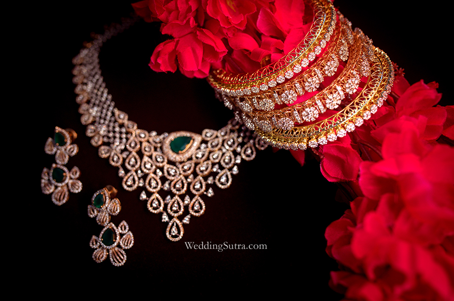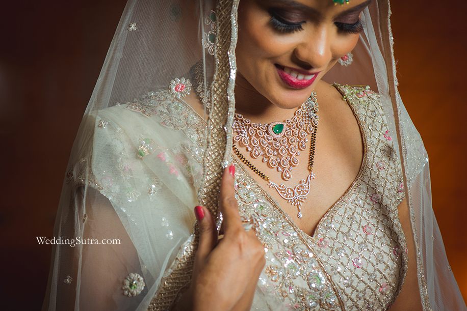 As Meghavi’s Gujarati bridal makeover required the bride to wear an outfit dominated by the color white, the jewellery chosen for her was also dominated by white diamonds. A diamond necklace set from Kalyan Jewellers’ Muhurat Collection with a bright emerald placed in the center added a perfect pop of color. For that traditional glam look, the bride also wore a Damani which is a variant of the quintessential ‘matha patti’ (forehead ornament). A few diamond bangles along with the famed Bangadi from Kalyan Jewellers completed her Gujarati bridal look. Right from her mangalsutra to her wedding ring, Meghavi was an epitome of the quintessential Kalyan Jewellers ‘Muhurat Bride.‘