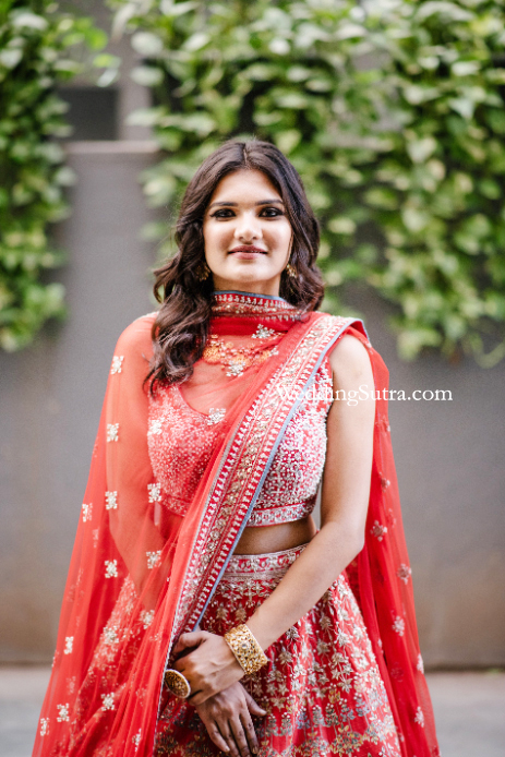 Miloni’s striking red lehenga by designer Anita Dongre had a voluminous skirt that presented minute detailing and baroque style handiwork inspired by the art of Pichhwai. Miloni says, “I was dithering between a pink or red lehenga for my wedding ceremony. This shoot helped me make up my mind. The red lehenga I ended up wearing caught my attention from the moment I saw it. The color was very traditional but after wearing it, I realized how well it complemented my skin tone.”
