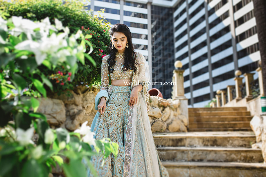 A pastel blue silk ensemble by Manish Malhotra paired with modern jewelry by Tanishq and flawless makeup courtesy Lakme transformed her into a chic bride.