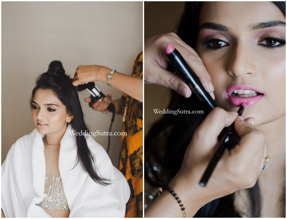 Makeup artist Sejal Sachnakul of Makeovers by Sejal created a dreamy visage on Minnat with trusted products from Lakmé’s newest range – the Kareena Kapoor Khan Collection by Lakmé Absolute as well as the existing Lakmé Absolute range. It was all about metal with mettle when it came to the iriscendent eyeshadow on Minnat’s lids which matched the sheen of her lehenga. Making use of the shimmering copper pigments, Sejal drew light to Minnat’s eyes, which brightened the entire look. Minnat was impressed by the whole process, and shares, “Sejal was fabulous and one of the sweetest people I have met. She is someone who you would want to have by your side on your wedding. The look that she created for me was flawless. She worked with my complexion instead to trying to work against it. She did not try to lighten my skin color. Instead, she drew attention to my more prominent features which I appreciated. She even helped me out with my pre-bridal routine and even gave me tips on the kinds of foods that I should eat.” Manjula Sachin Jadhav styled Minnat’s hair in way that played off her glossy tresses to perfection.