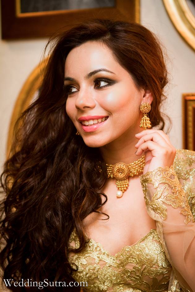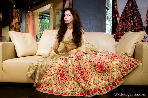 “The moment I entered Monisha Jaising’s store in Pali Hill I was taken in with the very chic and glamorous feel of the place. A team member of WeddingSutra greeted me with the warmest smile and we started off by carefully sifting through the collection. Even before I entered the store I was clear about one thing– I wanted a modern and non-traditional bride look. A style that defined me and not what an Indian bride is supposed to look like. And Monisha Jaising’s collection well-matched my style ethos. With so many looks on display- from glamorous gowns to stylish lehengas it was hard to pick one outfit without being tempted by another. But finally, team WeddingSutra and Ojas, the amazing Makeup Artist helped me and we chose a gold beige lehenga, with red and pink floral motifs and teamed with a delicately constructed chantilly lace blouse.