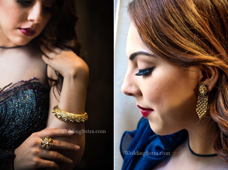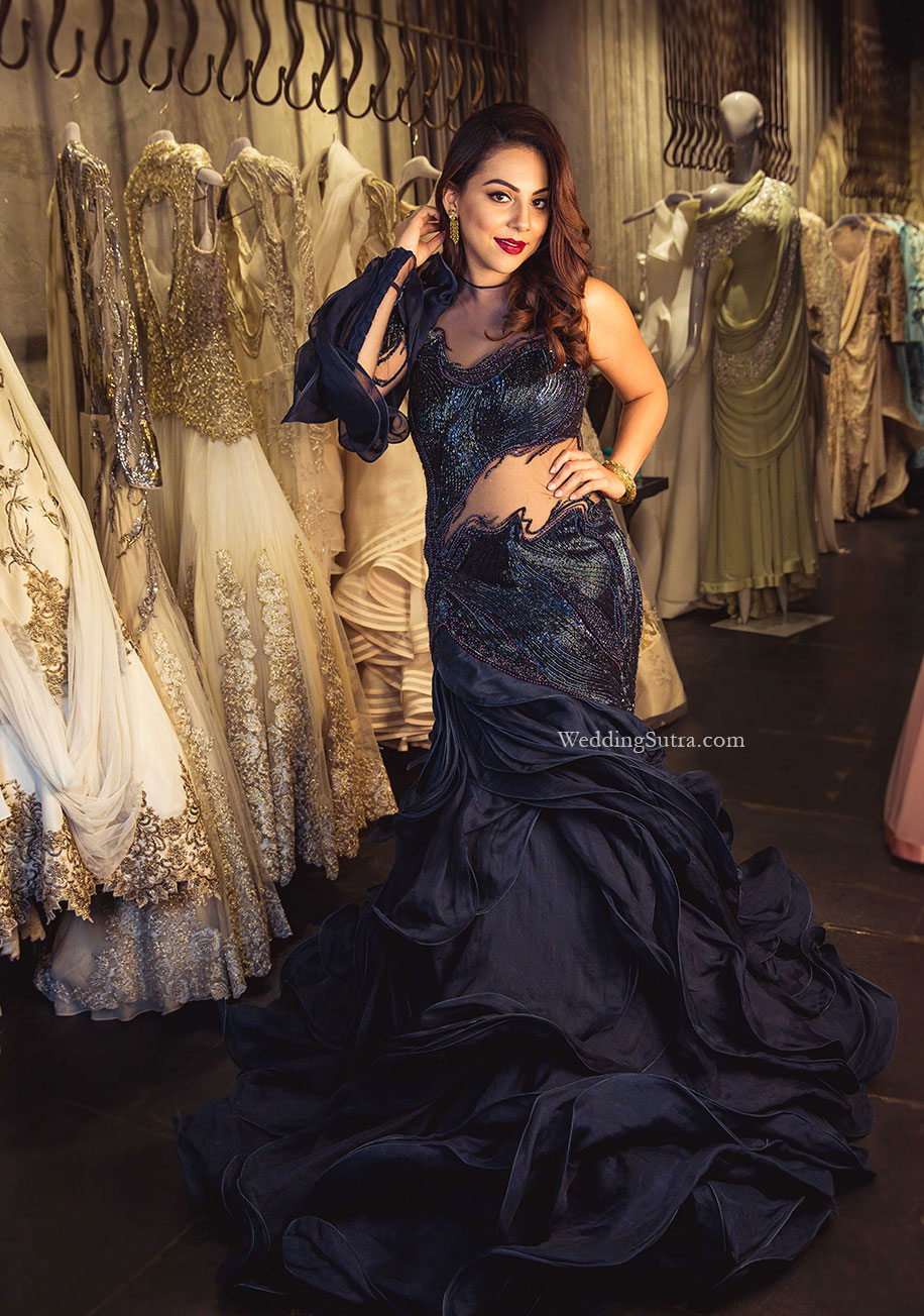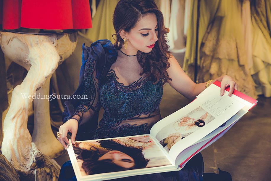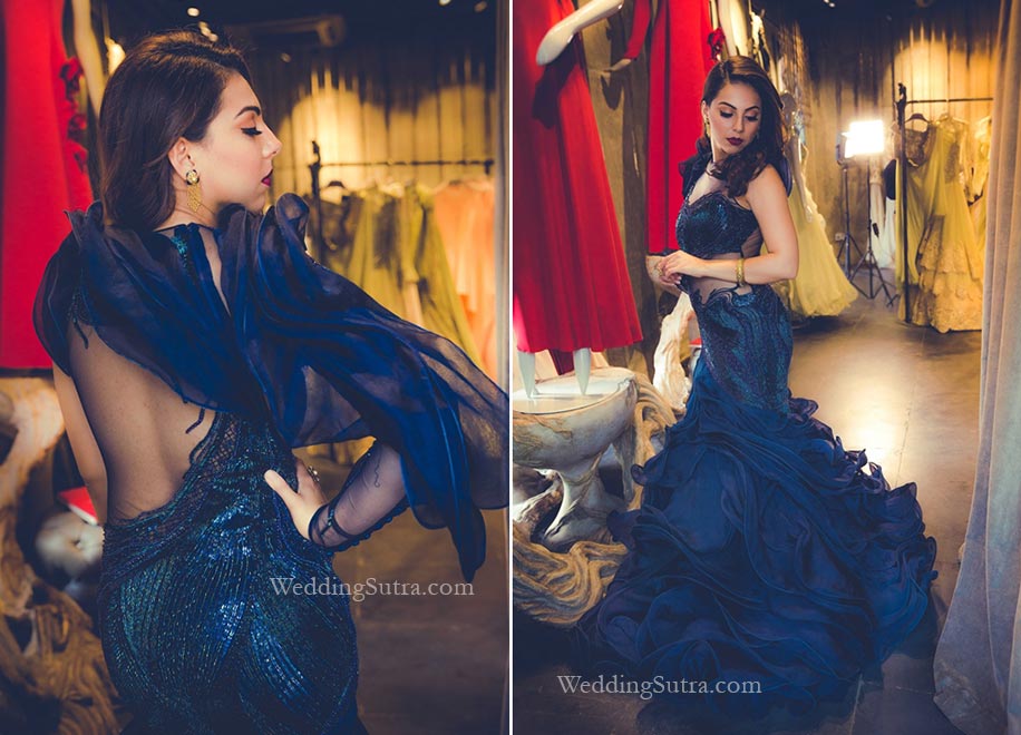 In the final of this three -part series, ‘bride-to-be Neha Bijlaney shares her experience at the WeddingSutra on Location shoot at the Gaurav Gupta Studio, Mumbai. The bride-to-be wore a stunning navy blue, fishtail silhouette gown with ruffled details and beautiful earrings and statement bangles from Azva. Makeup artist Lekha Shah conjured an aura of glamor with the finest Lakme Absolute products. It was all captured on camera by photographer Deepanshi Kapoor of Happyframes Photography who ensured that the girls had all the fun during the shoot.