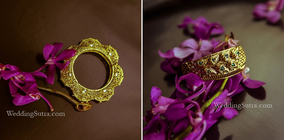 While the bride’s trousseau is what everyone is interested in, its her jewellery that takes the look to the next level. Neha matched her clothes with a wonderful set by Azva and showed us that she knew exactly how to be the bride everyone will be talking about. The necklace she selected features seven floral motifs, each a representation of one of the seven vows of marriage. The piece features relief work in gold and the details will impress even the most discerning eye. “The necklace set was beautiful and I knew I wanted to wear it as soon I saw it,” Neha says, “What worked in my favor was the floral theme it shared with the blouse I was wearing. Each resonated with the other.” Neha also picked gold kadaas and statement rings featuring fine detailing and exceptional craft.