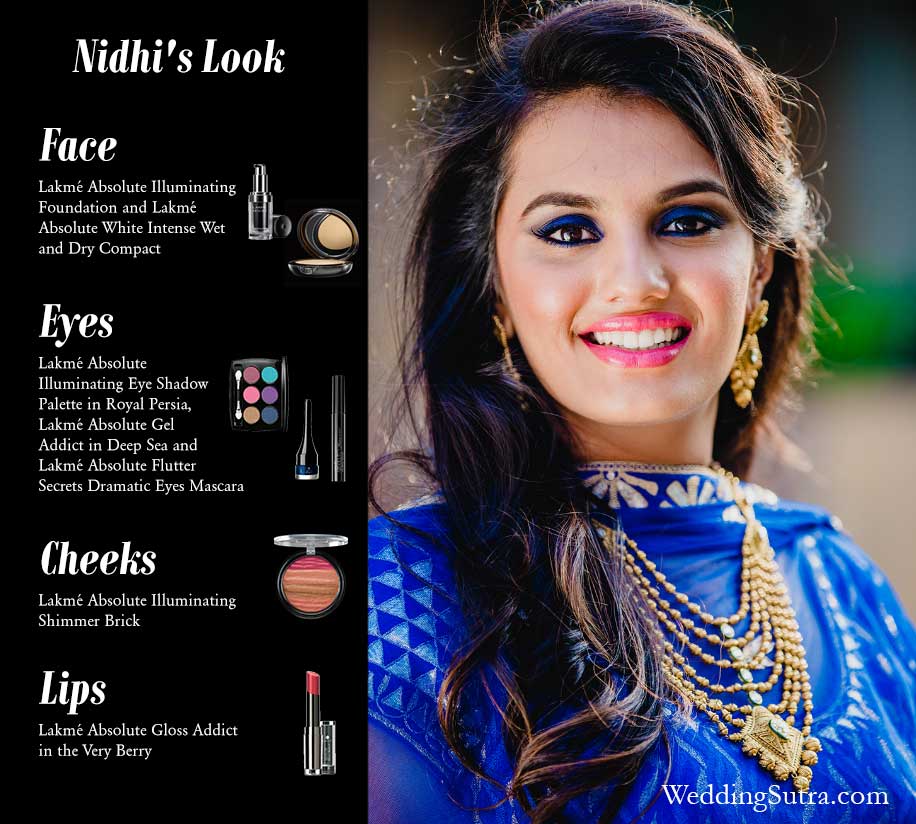Makeup artist Tejas Shah decided to make the most out of Nidhi’s flawless, dusky skin tone. He started with the Lakmé Absolute Illuminating Foundation for a truly smooth finish, touched up with a gentle brush of the Lakmé Absolute White Intense Wet and Dry Compact to set the base. Since the main focus was the eyes, he used the Lakmé Absolute Illuminating Eye Shadow Palette in Royal Persia with a hint of the blue to bring a shimmery effect to the eyelids. For drama, he lined the waterline with the Lakmé Absolute Gel Addict in Deep Sea making the eyes pop! Generous coats of Lakmé Absolute Flutter Secrets Dramatic Eyes Mascara accentuated the lashes for a vivid, smoky eye look. Nidhi’s face was touched with just a hint of Lakmé Absolute Illuminating Shimmer Brick to create a natural looking bridal blush and finished with a whisper of Lakmé Absolute Gloss Addict in the Very Berry shade.
