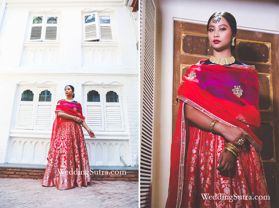 Looking majestic in a bright red lehenga paired with a royal blue blouse and a dupatta from Raw Mango, Mumbai, with makeup by the talented Kajol R Paswwan using Lakme Absolute and wearing bespoke gold jewellery by Azva, Nijhum’s bridal look was captured by ace photographer Stuti Sakhalkar Dasgupta of The Cheesecake Project.