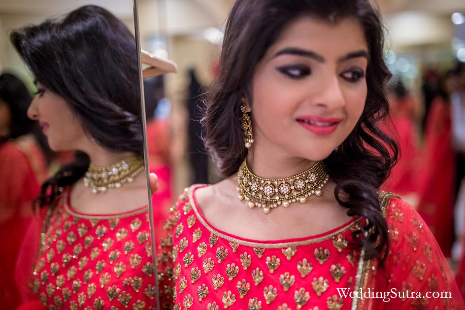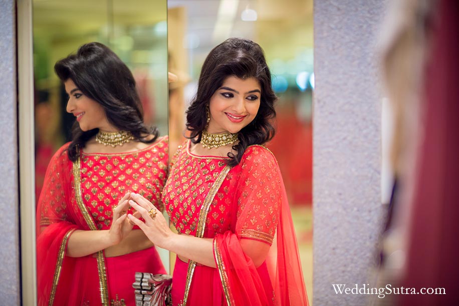 The day started with lehenga trials at the Neeta Lulla Studio in Santa Cruz, Mumbai. “I was very enamored by the boutique and was confused about choosing a lehenga because each one of the designer’s creations exuded so much beauty. Finally, after much thought, I decided to wear a bright red Anarkali lehenga with intricate zari embroidery. I chose the color because it complemented my skin tone perfectly and also matched the intricate necklace set from Azva.
